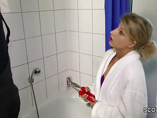 Reife deutsche Stiefmutter erwischt ihren Stiefsohn beim Sex und macht mit